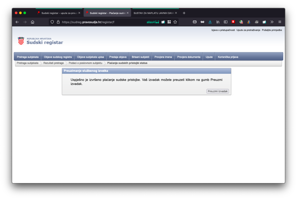 Nakon uspješnog plaćanja bit ćete preusmjereni na stranicu s poveznicom (linkom) za preuzimanje službenog e-izvatka.