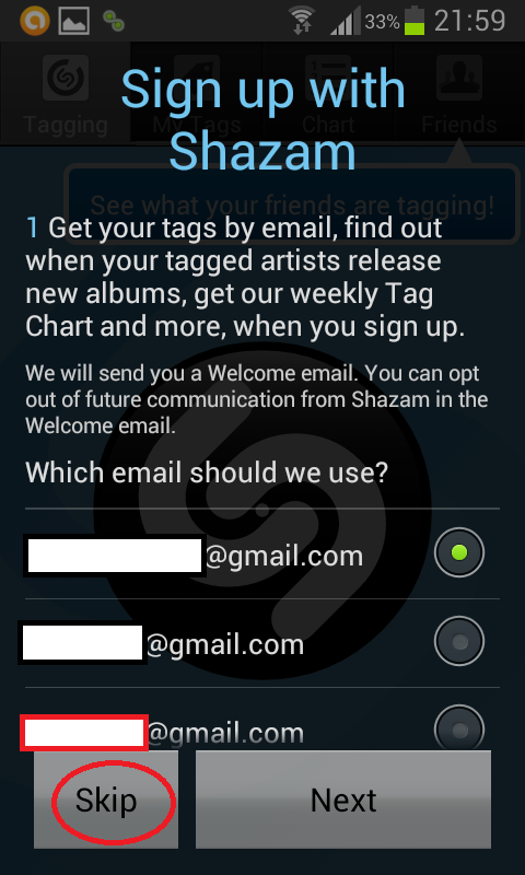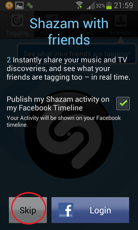 Pri prvom pokretanju aplikacije postoji mogućnost neke osnovne prilagodbe i konfiguracije. U ovom koraku se možete registrirati na Shazam servisu kako bi dobivali naknadne informacije o prepoznatim i označenim pjesmama. Mi ćemo preskočiti ovaj dio:)