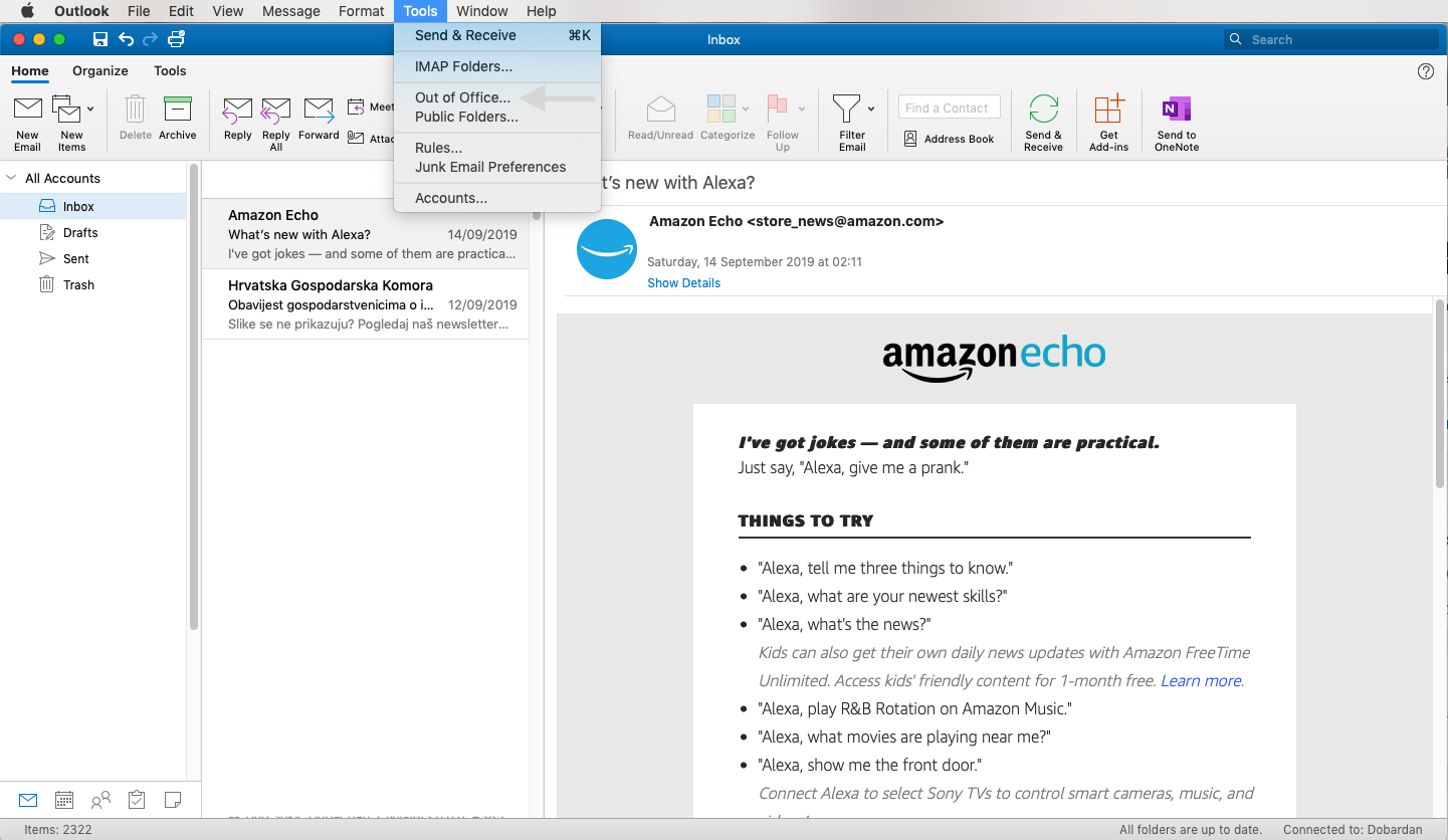 Kako biste uključili Out of Office na Macu, otvorite Microsoft Outlook, zatim u alatnoj traci na vrhu ekrana pritisnite Tools (Alati).
