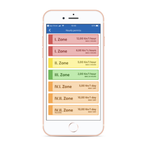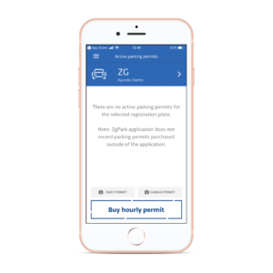 Kad ste ušli u aplikaciju, pritiskom na Buy hourly permit (Kupi satnu parking kartu) možete kupovati parkirališne karte za sve zone pa odaberite odgovarajuću, odaberite prethodno uneseno vozilo, broj sati i potvrdite kupnju pritiskom na Buy (Kupi).