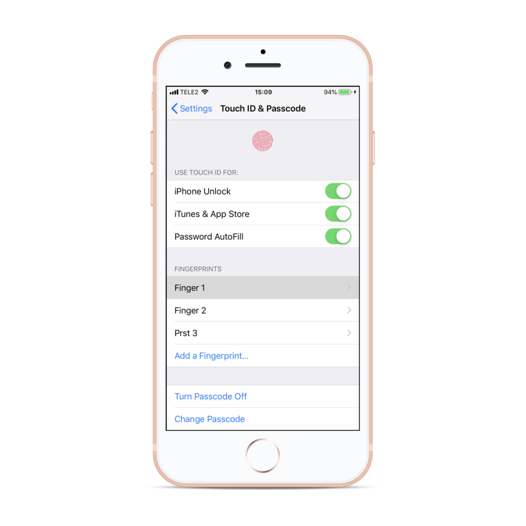 Prilikom prvih koraka postavljanja vašeg iPhonea nudi vam se mogućnost (Touch ID) izrade otiska prsta pomoću kojeg možete otključati svoj iPhone. Osim prsta palca možete dodati i ostale, jer je prilično praktično imati i neke ostale prste evidentirane za otključavanje, npr. otisak palca druge ruke.
