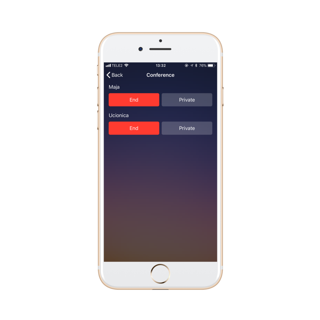 Na ovom ekranu možete završiti razgovor s pojedinim učesnikom pritiskom na crvenu tipku end (kraj) ili se prebaciti na privatni razgovor s određenim učesnikom pritiskom na private (privatan razgovor). U trenutku kada odaberete privatan razgovor, svi drugi učesnici su stavljeni na čekanje te ne mogu čuti razgovor između vas i druge osobe.