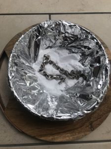 U posudu obloženu aluminijskom folijom stavite dvije žlice soli i dvije žlice sode bikarbone, sve skupa promiješajte i unutra stavite nakit koji želite očistiti.