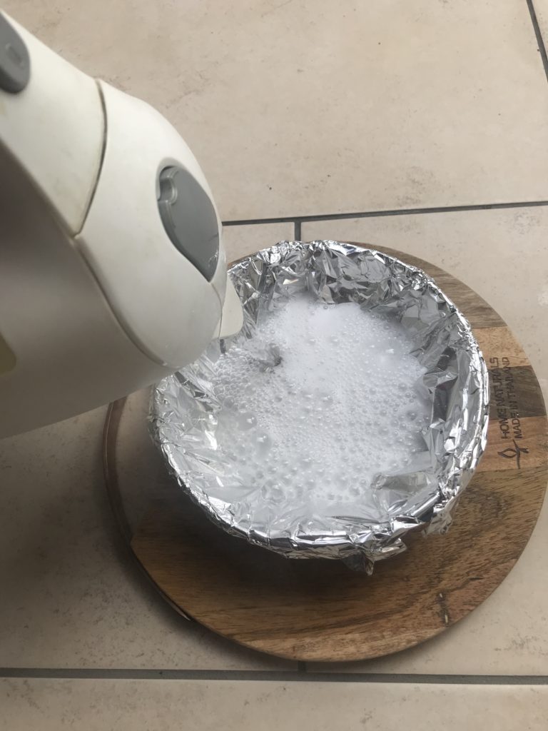 Posuda (keramika, staklo), aluminijska folija, kipuća voda, 2 žlice sode bikarbone, 2 žlice soli i četkica.